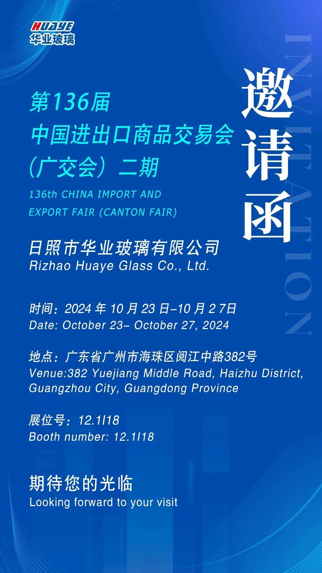 The 136th Canton Fair II (2024 China Import and Export Fair) will be grandly carried out in Guangzhou from October 23-October 27. Rizhao Huaye Glass Co., Ltd. will take part in this fair, Booth No. 12.1I18.
